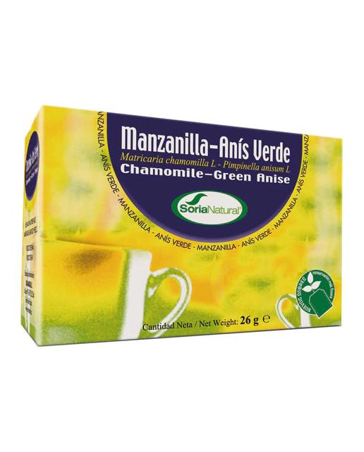 Las infusiones de Manzanilla y Anís Verde de Soria Natural son ideales para disfrutar de una bebida reconfortante y digestiva. Este producto se presenta en un formato de 20 bolsitas filtro, lo que facilita su preparación. Los ingredientes incluyen Pimpinella anisum L. (frutas) con una cantidad de 0.741 g y Matricaria chamomilla L. (capítulos florales) con 0.559 g.
