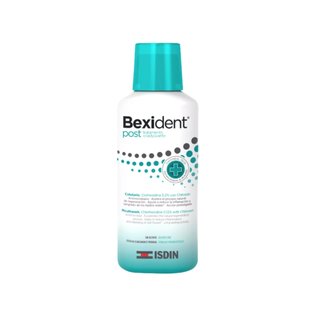 De venta en Farmacia Bonnín, tu farmacia de confianza. Modo de empleo · Utiliza Bexident® Post Tratamiento Coadyuvante Colutorio 3 veces al día, después de cada comida. Llena el vaso dosificador hasta la línea marcada. No diluir y enjuagar entre 30 y 60 segundos Composición · Clorhexidina 0,2%: aporta una acción antimicrobiana de amplio espectro, ayudando a prevenir infecciones. · Chitosán: polisacárido natural obtenido de la quitina que proporciona acción regeneradora, antimicrobiana y hemostática. · Pantenol: ayuda a reducir la inflamación en procesos de recuperación posquirúrgicos. · Alantoína: facilita el proceso de regeneración de las encías y de la mucosa epitelial.