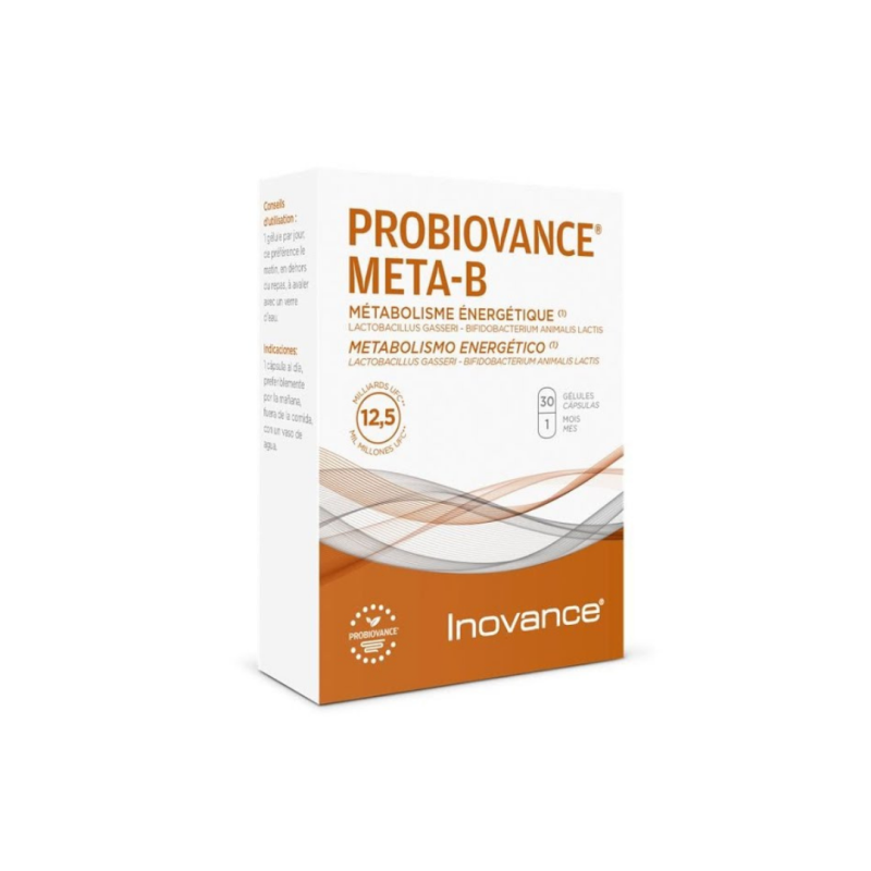 · Todo este conocimiento de la microbiota hace posible proponer un nuevo enfoque para la pérdida de peso. Inovance PROBIOVANCE META-B combina 2 cepas microbióticas, Bifidobacterium animalis lactis y Lactobacillus gasseri, con vitaminas B1-B2-B12 que contribuyen a un buen metabolismo energético.