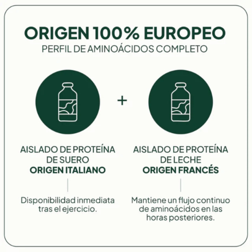 Composición · Aislado de proteína de LECHE (MPI): fuente completa de aminoácidos esenciales, clave para la síntesis de proteínas y el mantenimiento muscular. Se obtiene a partir de un proceso de purificación y ultrafiltrado de la leche que elimina grasas y carbohidratos (incluyendo lactosa) dejando una proteína de alta pureza con un 80% de caseína y un 20% de suero, la proporción original y natural proteica de la leche. · Aislado de proteína de suero (LECHE) (WPI): fuente ultrafiltrada de proteína, rica en aminoácidos esenciales,especialmente la leucina, el aminoácido clave para activar la síntesis de proteínas musculares. Gracias a su absorción ultrarrápida, es el complemento perfecto del aislado de proteína de leche, ya que ofrece un flujo inmediato de aminoácidos al músculo, maximizando la captación de proteínas tras el ejercicio en el menor tiempo posible. · Lactasa (Aspergillus oryzae): enzima digestiva que facilita la digestión de la lactosa, minimizando el contenido de la misma en la proteína y reduciendo la posibilidad de molestias digestivas en personas sensibles al carbohidrato lactosa. · Bromelaína (Ananas sativus) y papaína (Carica papaya): enzimas digestivas proteolíticas que optimizan la descomposición de proteínas, mejorando el aprovechamiento de los aminoácidos que componen las proteínas y favorecen su tolerancia gastrointestinal.Otros Detalles