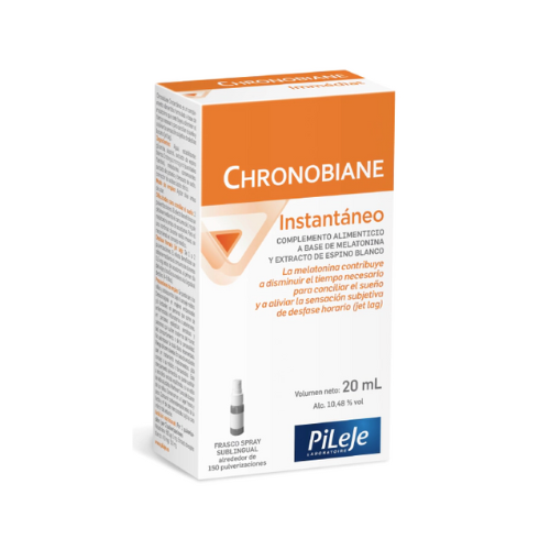 · Chronobiane Inmediato es un complemento alimentario en forma de espray sublingual (pulverización bajo la lengua) a base de melatonina y extracto de espino blanco. Puede conseguirse una «resincronización» reforzando los aportes de melatonina gracias a 1 o 2 pulverizaciones de Chronobiane Inmediato al acostarse o en el momento del despertar (1 pulverización aporta 0,5 mg de melatonina).