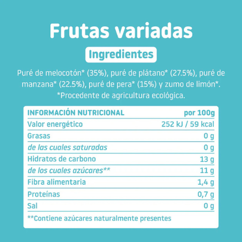 Puré de melocotón* (35%), puré de plátano* (27.5%), puré de manzana* (22.5%), puré de pera* (15%) y zumo de limón*. *Procedente de agricultura ecológica.