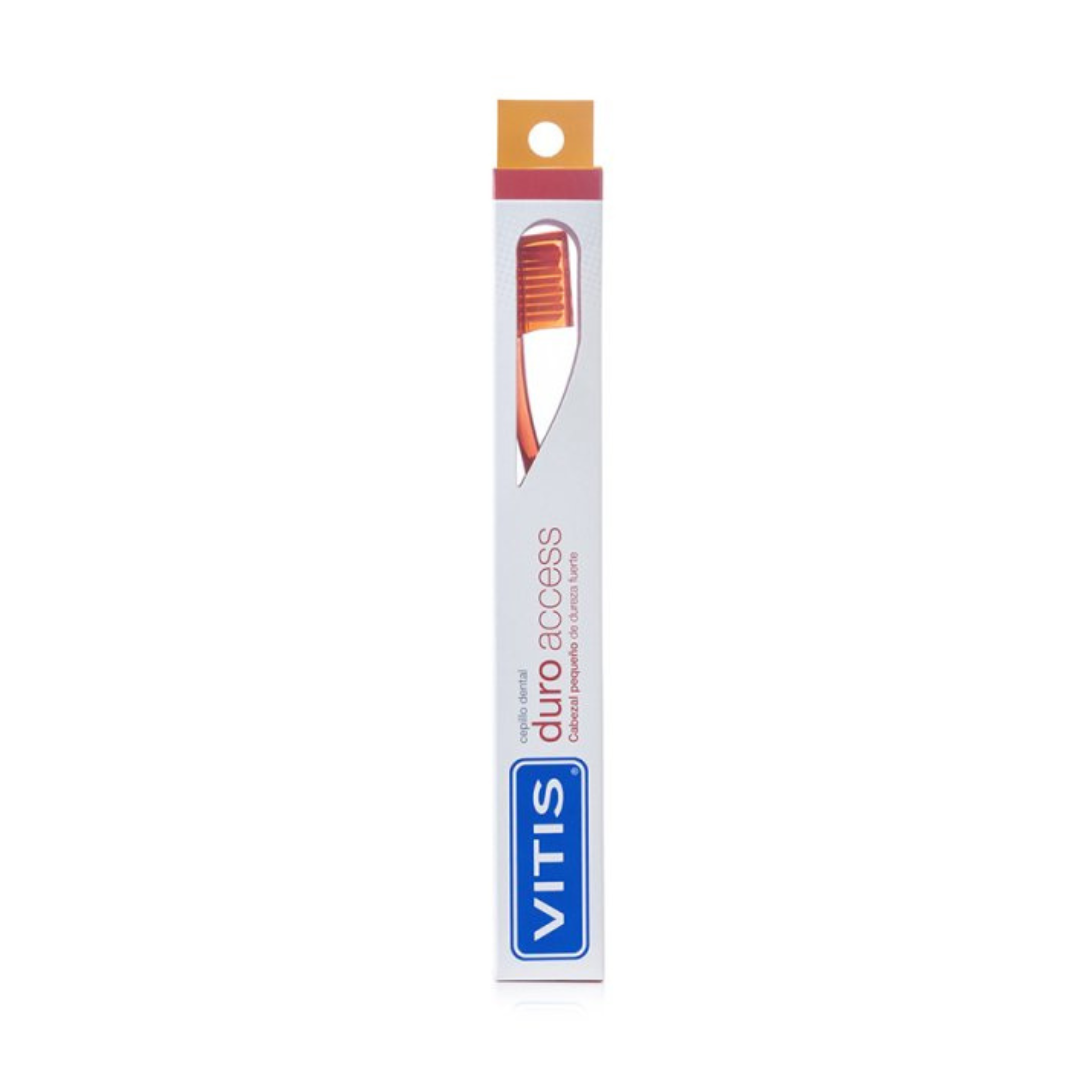 · VITIS® duro access es un cepillo de uso diario con cabezal de tamaño pequeño que permite acceder fácilmente a las zonas posteriores de la boca y disminuir los posibles reflejos nauseosos. Sus filamentos duros y con perfil ondulado, facilitan el acceso a los espacios interdentales y se adaptan a la forma de los dientes.